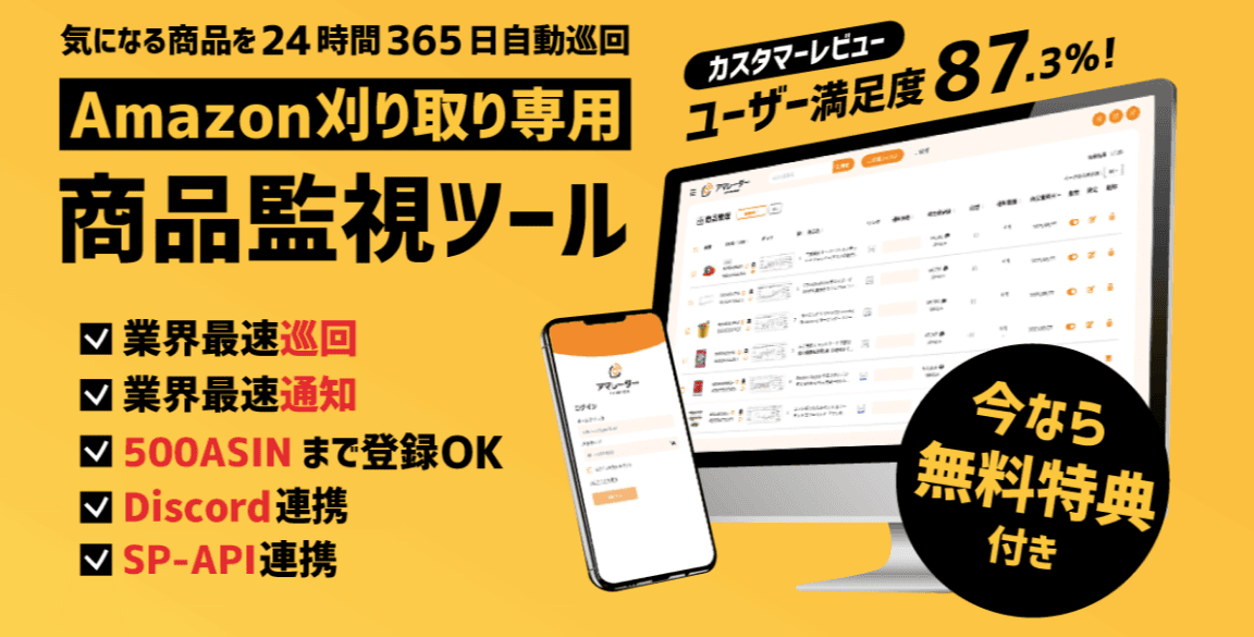 アマレーダーは、価格変動を高速で検知して通知する、Amazon刈り取りに特化した自動監視ツールです。