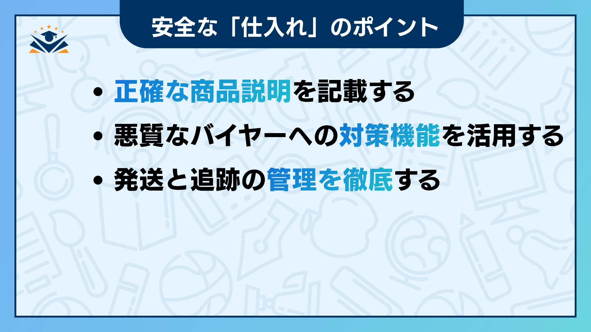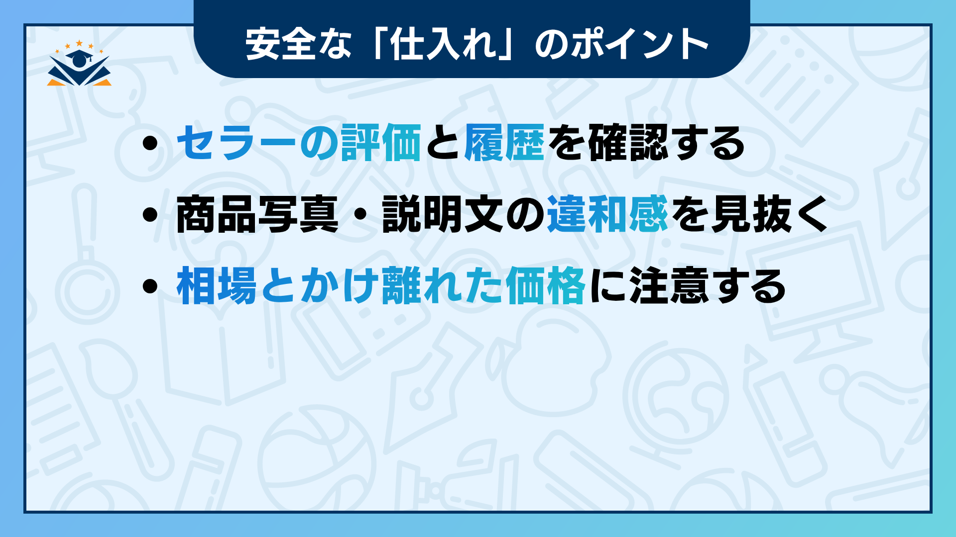 安全な仕入れを実現するには、取引相手と商品の信頼性を自分自身で見極めることが重要です。