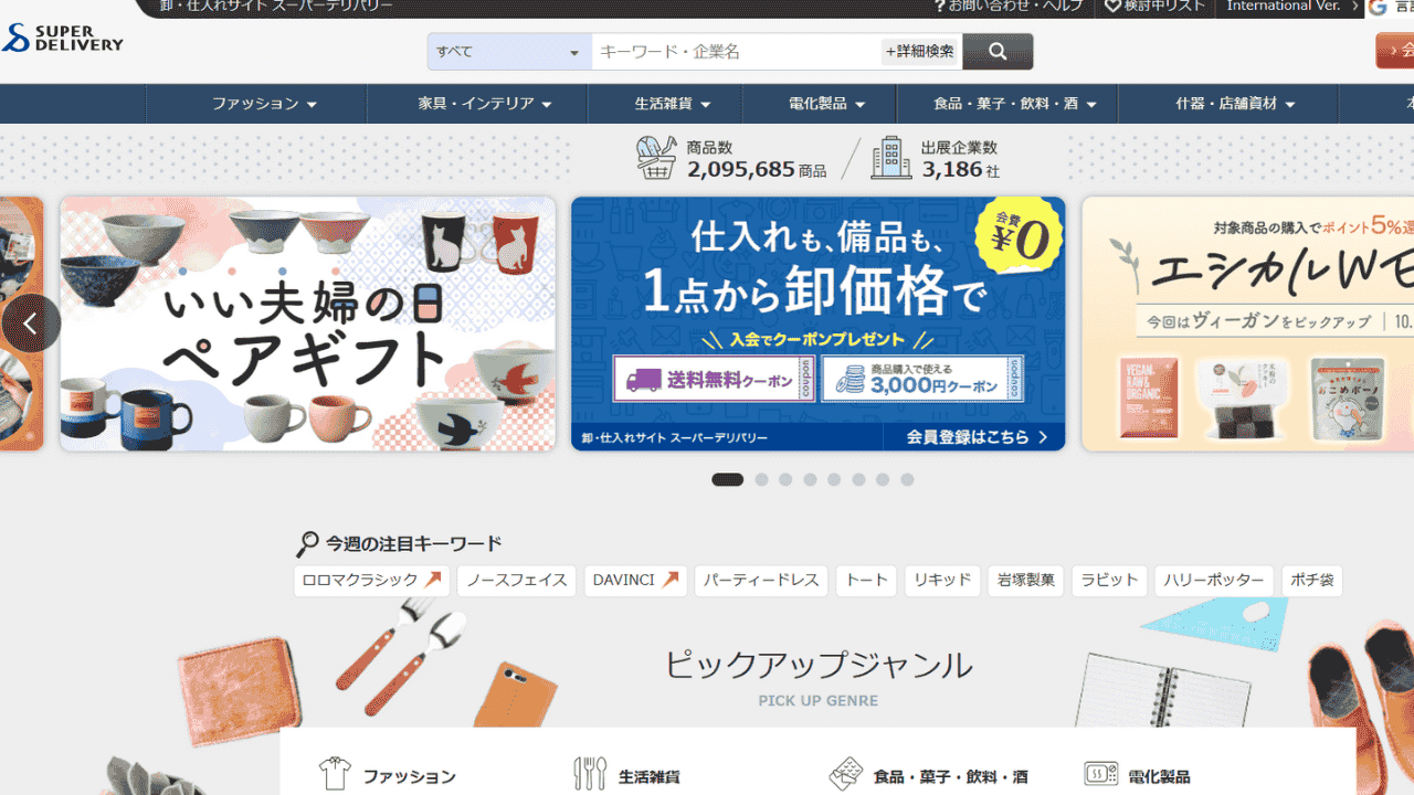 スーパーデリバリーは、NETSEA(ネッシー)と並ぶ国内最大級の卸・仕入れサイトです。