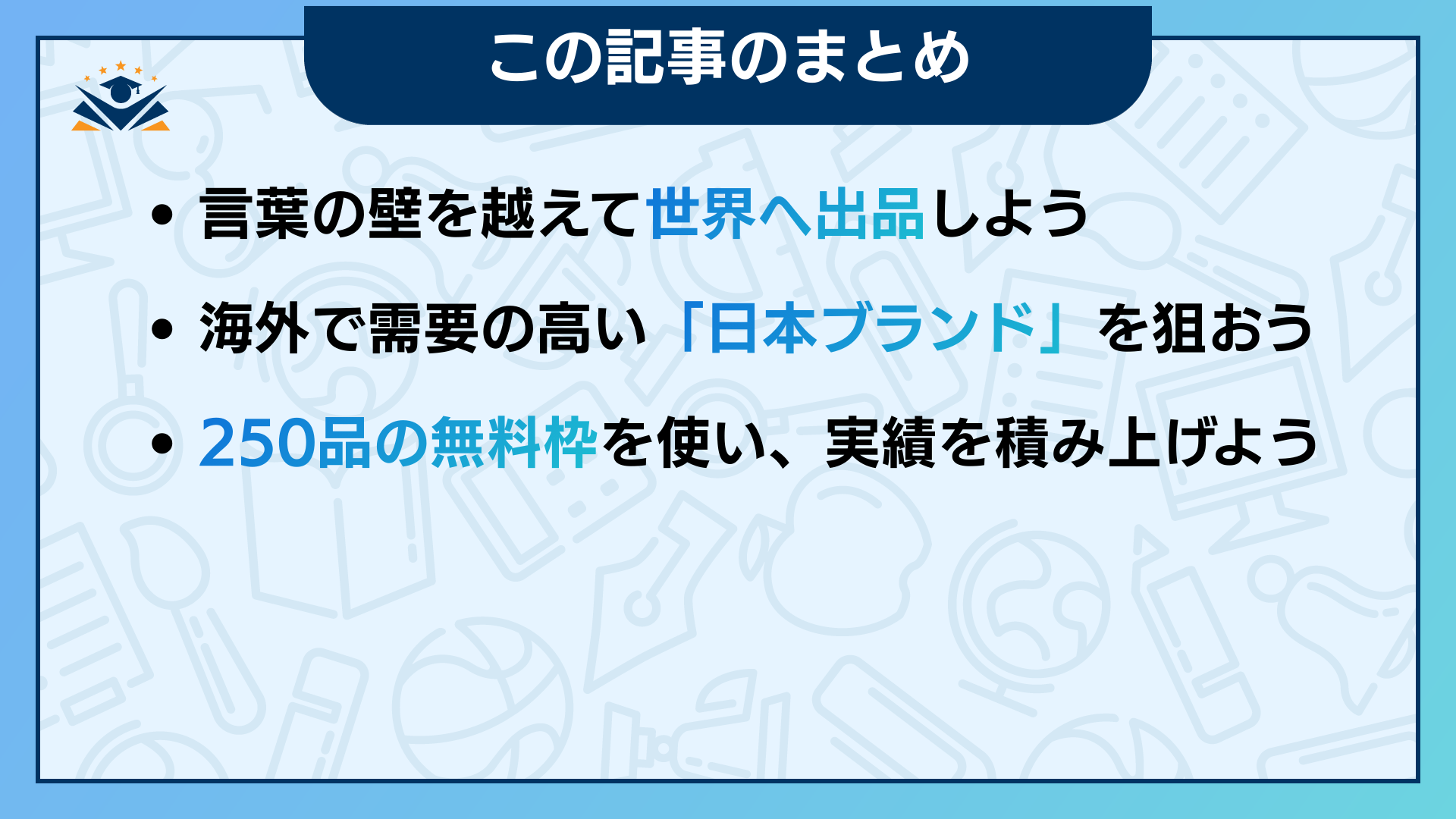一つひとつのステップを順番にクリアしていけば、誰でもスムーズに世界へ向けた出品を完了できます。